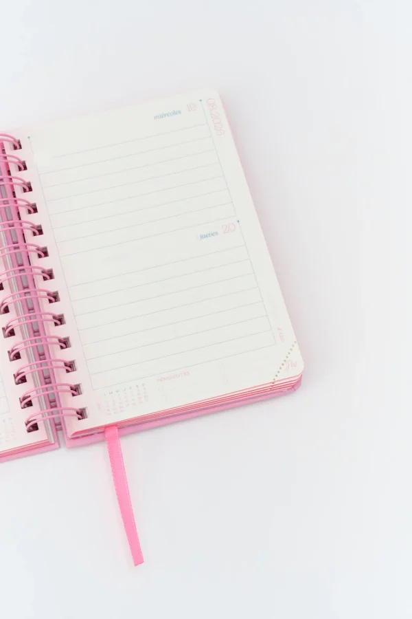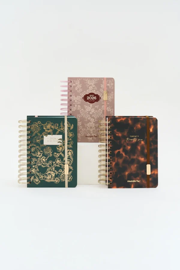 Agenda FW 2026 12×17 (2 días por página): incluye planner anual, control de gastos, carátulas, sobre interno, troquel señalador, charm, elástico y 2 hojas de stickers. Compacta y práctica para organizar con estilo.