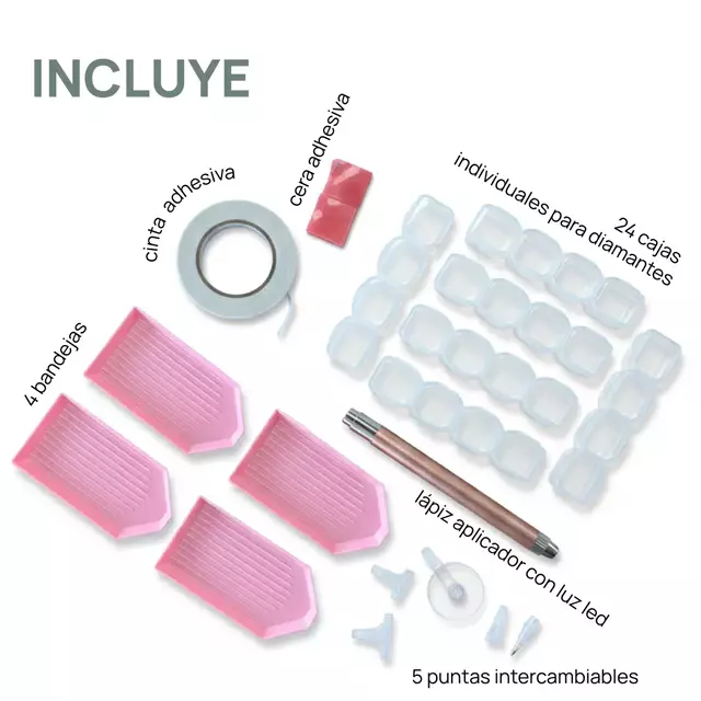 Lápiz LED de Precisión: Incluye un aplicador con luz integrada para ver los símbolos del lienzo con claridad, incluso en ambientes con poca luz.