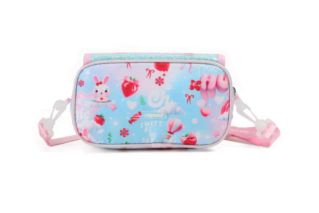 Una opción tan práctica como adorable para acompañar cada recreo. Esta canopla con correa regulable permite llevarla tipo bandolerita, ideal para quienes buscan comodidad y estilo a la vez. Su diseño es un festival de ternura: la estampa de Bunny se luce sobre una base con brillo encapsulado, generando un efecto mágico y súper llamativo. El material frontal es de plástico rígido, suave al tacto, y con un acabado que resalta los colores y el glitter, integrando toda la estética Chimola de manera encantadora. Tiene un formato clásico, simple y funcional: dos compartimentos con cierre y un bolsillo de red interno que permite mantener todo a mano, sin necesidad de elásticos ni divisiones complejas. Perfecta para llevar lo justo y necesario, sin perder el toque cute.