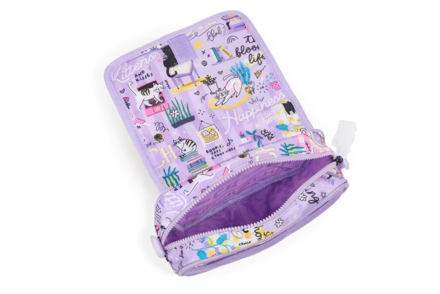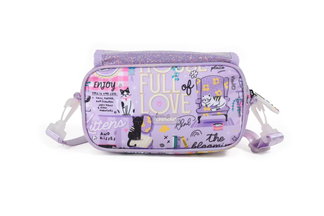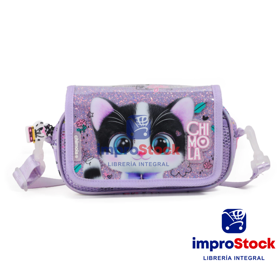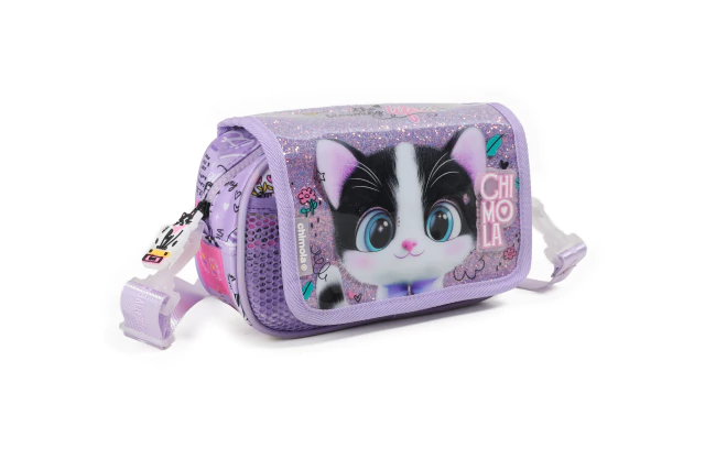 Una canopla con mucha personalidad, ideal para quienes disfrutan llevar estilo hasta en los detalles más simples. Su diseño compacto y funcional está pensado para acompañar el ritmo del día a día escolar, combinando practicidad con una estética encantadora. En el frente, la estampa de la gatita se realza con un fondo con glitter encapsulado y un recubrimiento plástico brillante que potencia su efecto visual. Además, el logo CHIMOLA en relieve aporta un toque de diseño muy especial. Viene con correa regulable para colgar tipo bandolera: perfecta para llevar al recreo con total comodidad. Su interior es simple y ordenado: cuenta con dos compartimentos con cierre y un bolsillo de red interno que permite ver y acceder fácilmente a los elementos. Todo pensado para mantener lo esencial a mano, sin perder el toque lúdico que caracteriza a la colección.
