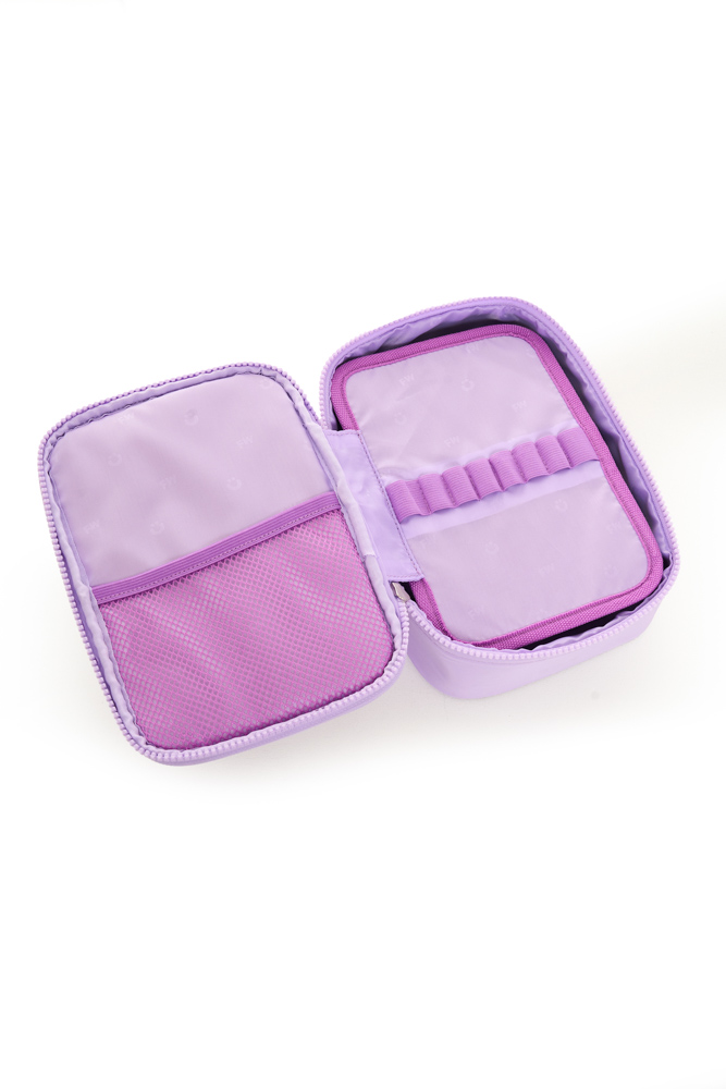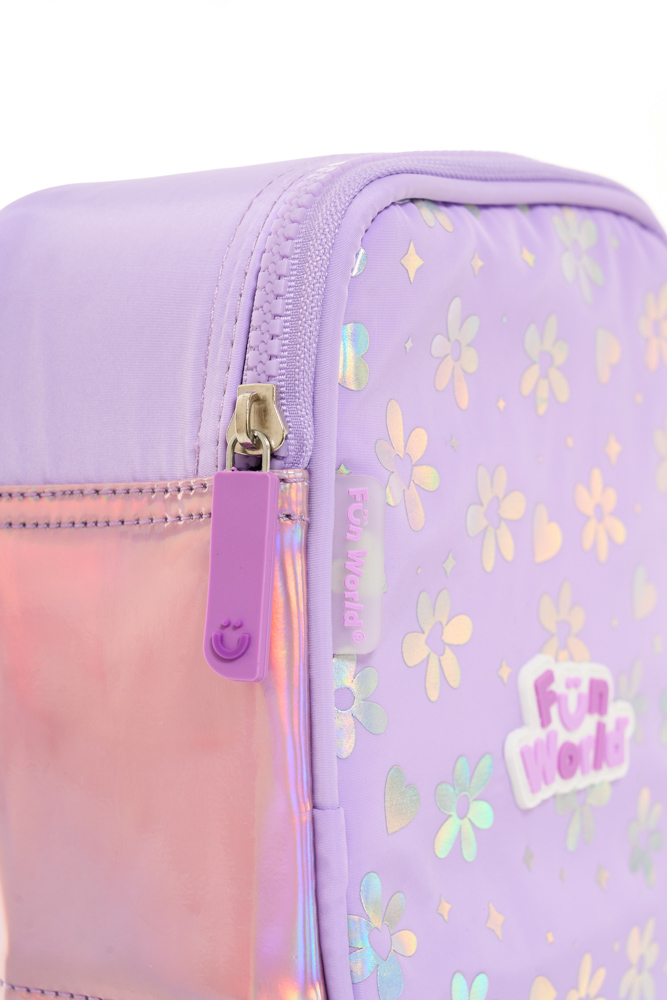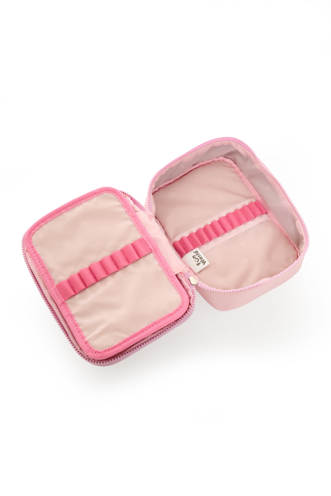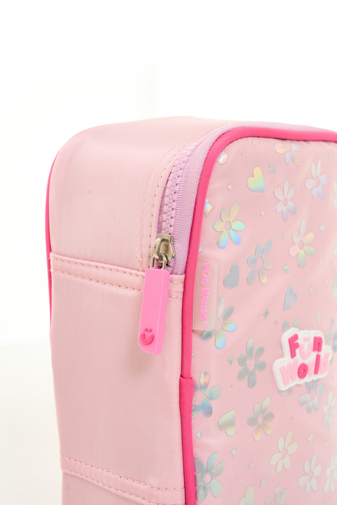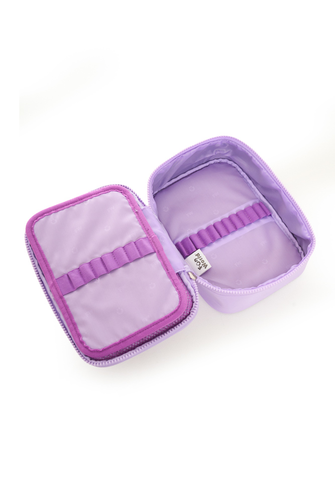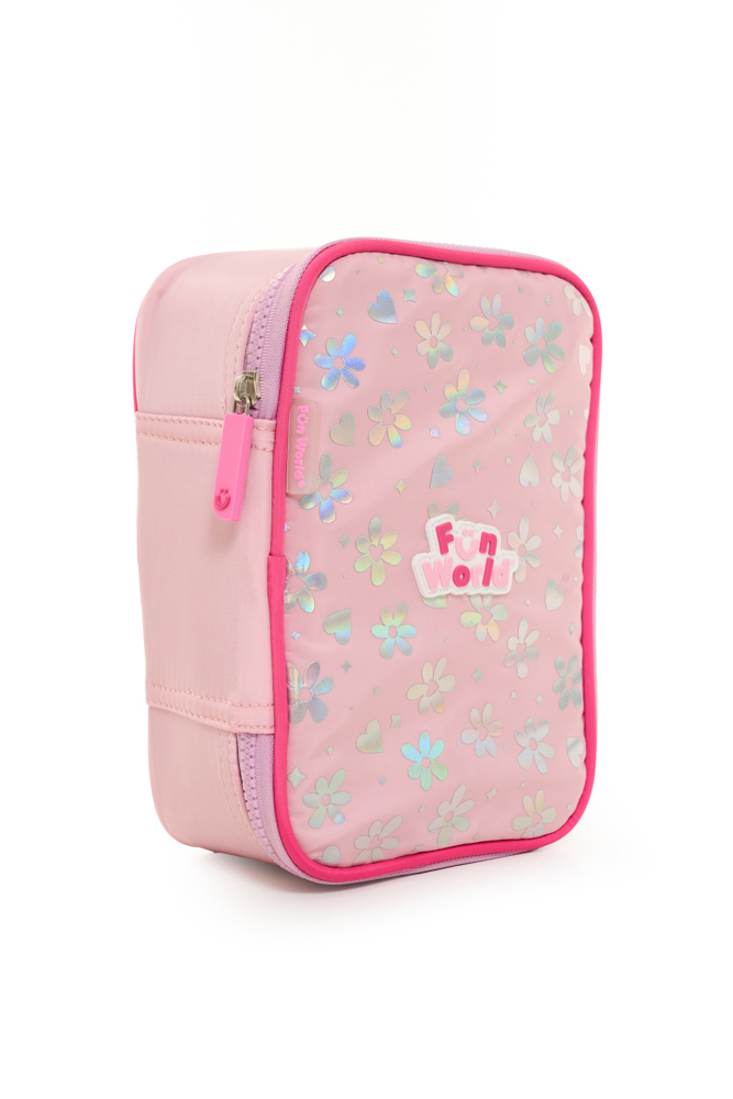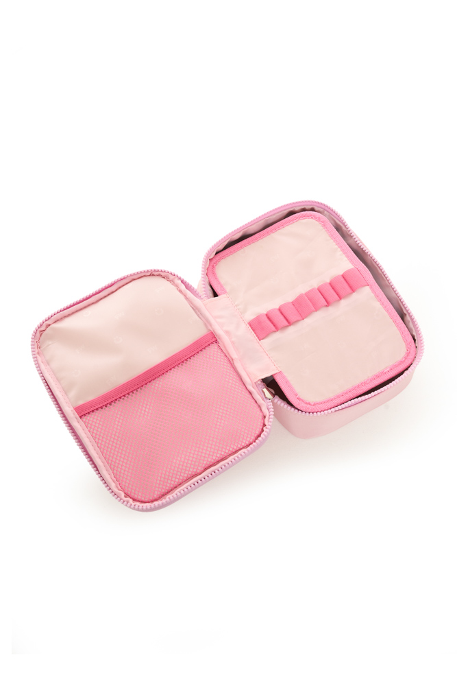 Cartuchera Lovely Rectangular Delicada y funcional, confeccionada en textil impreso con hot stamping holográfico que le da un toque brillante y moderno. Cuenta con 28 elásticos regulares y bolsillo de red para una mejor organización, además de name tag, tirador simple y cierre diente de perro resistente. Disponible en dos colores, es ideal para organizar tus útiles con estilo y encanto.