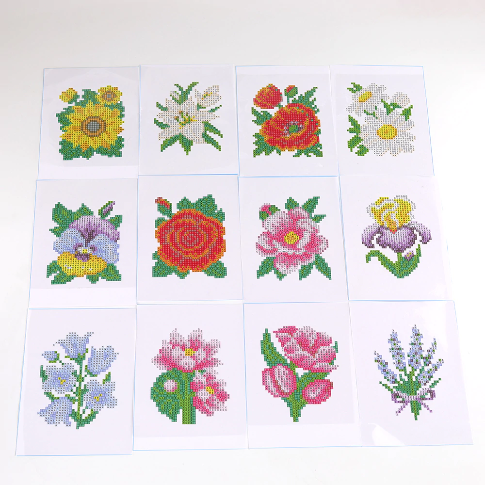 – Incluye 12 mini canvas de 12×17 cm, todos con flores diferentes, más 12 lápices aplicadores, 12 bandejas, cera y diamantes clasificados por color.
