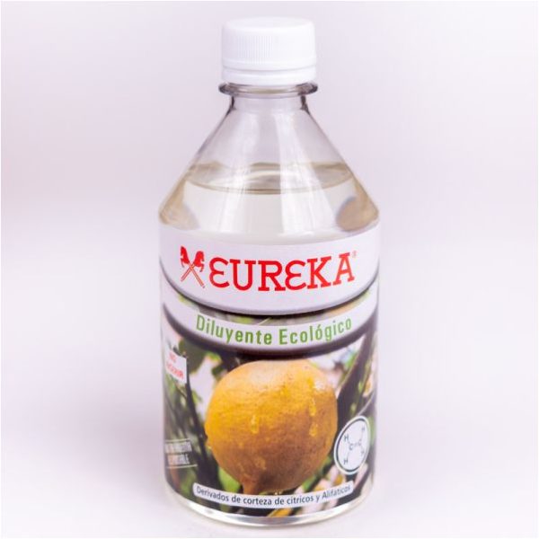 Diluyente Ecológico Eureka 500Ml, líquido transparente y limpio, altamente desodorizado. No desprende vapores tóxicos, ideal para personas de piel sensible y trabajos en ambientes cerrados, su baja tensión superficial favorece la disolución de: Oleos, oleo pastel, patinas y betún de Judea a la cera sin alterar tiempo de secado, brillo y adherencia.