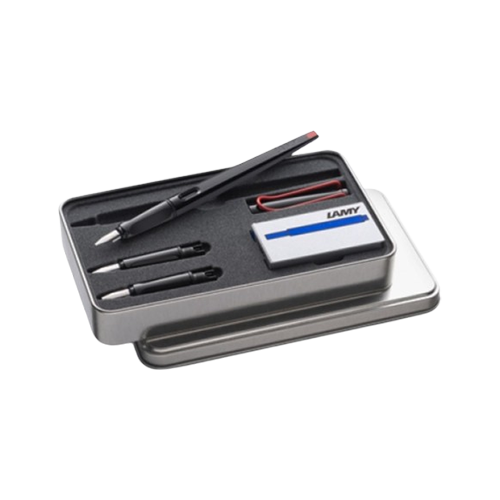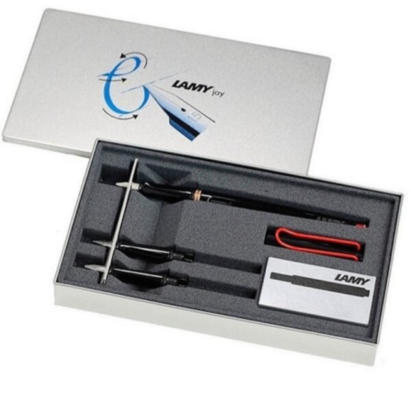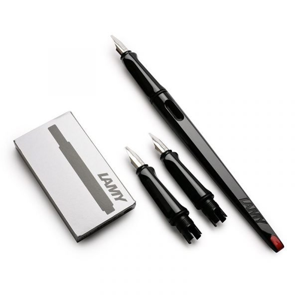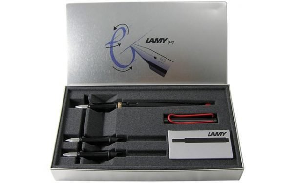 LAMY joy pluma estilográfica caligráfica  en negro brillante. Con 3 secciones frontales intercambiables (1.1 / 1.5 / 1.9 mm) y un paquete de cartucho de tinta T 10 negro, en caja de regalo de metal.