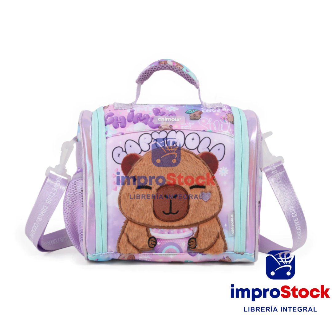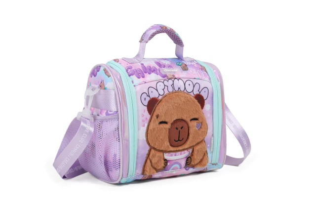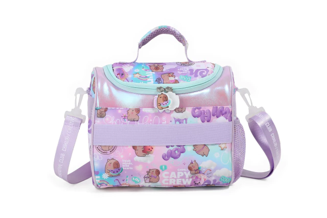 Una lunchera pensada para disfrutar cada pausa como si fuera un recreo mágico. Capymola combina texturas suaves con un universo gráfico que invita al relax: tonos pastel, ilustraciones chill y un diseño que se siente como un abrazo. Su carita ocupa todo el frente y está llena de detalles adorables que hacen de esta lunchera una pieza tan funcional como expresiva. Tiene interior térmico para conservar la frescura, bolsillos laterales con red, bolsillos internos organizadores, correa regulable y manija de agarre para llevarla como prefieras. Los apliques de goma, detalles en brillo y peluche, y los tiracierres personalizados completan un diseño lleno de encanto y personalidad.