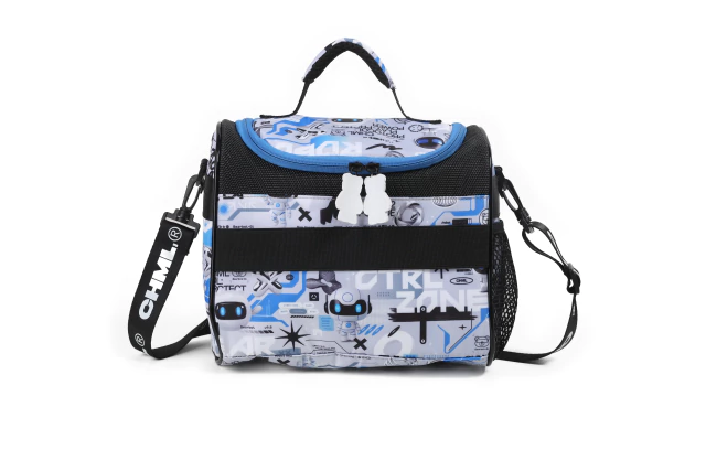 Una lunchera que parece salida del futuro, lista para activar el modo aventura. Con una estética robótica súper canchera, esta lunchera se destaca por su look techie: visor digital, contraste de materiales, aplique de goma y detalles gráficos que la hacen única. Su interior térmico mantiene todo en la temperatura justa, mientras que sus bolsillos laterales con red y los compartimentos interiores con red ayudan a mantener cada cosa en su lugar. Incluye correa regulable, manija de agarre y tiracierres de goma con el sello CHML. Todo con una vibe digital y moderna, ideal para quienes buscan diseño con personalidad.