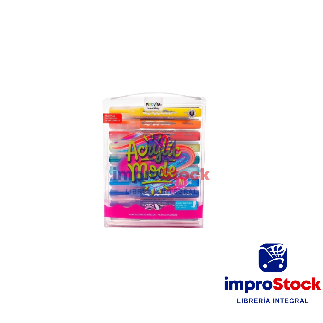 Los Marcadores Acrylic Mode Mooving x20 son un set versátil pensado para proyectos creativos, ilustración, lettering y manualidades. Incluyen 20 colores intensos con tinta acrílica a base de agua, de secado rápido y gran poder cubritivo, logrando un acabado opaco y uniforme. Permiten pintar sobre diversas superficies como papel, cartón, madera, plástico, vidrio y más. Su punta redonda ofrece trazos precisos y cómodos, mientras que el diseño ergonómico del marcador facilita su uso prolongado. Un kit práctico y completo para artistas, estudiantes y cualquier persona que disfrute de crear con color