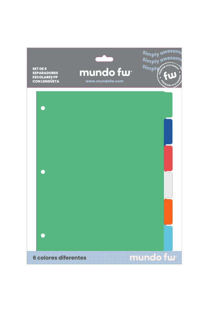 Set de 6 separadores con 6 colores distintos y lengüeta, . Con 3 perforaciones para facilitar su organización.