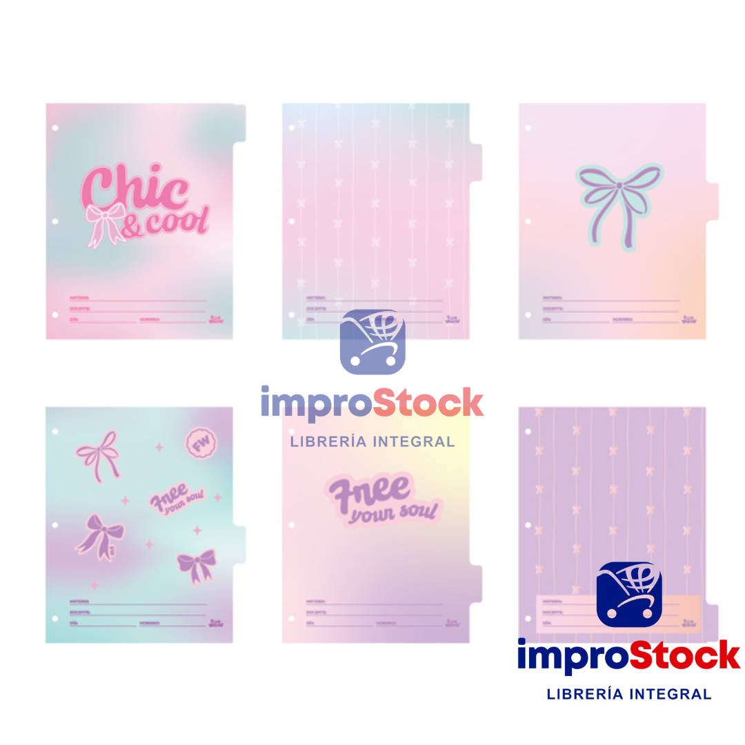 Set de 6 separadores con 6 motivos distintos y lengüeta, elaborados en papel cartulina de alta resistencia mate de alta calidad. Con 3 perforaciones para facilitar su organización. Viene en bolsa importada de alta resistencia. Medidas: 22,4 cm (con lengüeta) x 30 cm. Ideal para organizar documentos con estilo y durabilidad